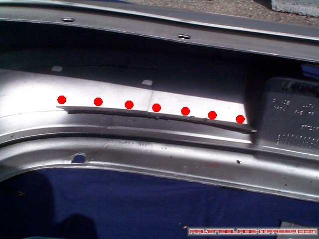 In this picture, you will see a string of red dots. There is a "rib" along these dots that will need to be cut back- there is an identical one to the other side of the license plate opening. These need to be cut back so that the bumper will fit up flush against the beam. Cut the rib back to within 1/4 inch or less of the cover, or it just will not fit against the beam. You will need to make two more cuts, one each side, in the "rib" below this one when you got to put the cover back on. I have not marked these cuts as it is best to do them when the bumper cover is refitted to the car. As much as it is tempting to just cut this rib all the way back too, I would advise against it as the ribs do help keep the bumper's shape. The rib above it HAD to be cut in order to fit, but this one just needs a notch put into it.