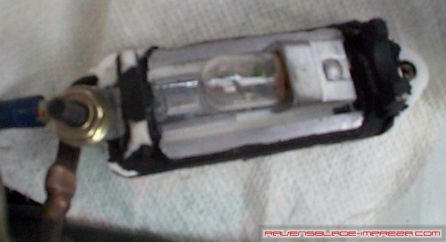 The next picture is of a high-intensity (about 5 Watt) side/clearance marker light I picked up at Walmart. It fits the requirements nicely: it has a bright bulb, is about 1.5" long (fits in the depression nicely), and most importantly...cheap! As you can see, I already have it wired to positive and negative. I recommend using about a 4 to 6 foot length of wires, so you can take the grill off and move it out of the way as necessary. You could alternatively put a set of quick disconnects in the lines so you can take the grill off completely.