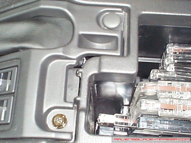 A quick how to remove the center console bits- Make sure the parking brake is engaged, and then open the center console cover, and locate the two screw caps. One has been pulled off above to illustrate. They just pop off if you gently pry up under them with a flathead screwdriver. There are two phillips screws that need to be removed under those caps, as seen below.