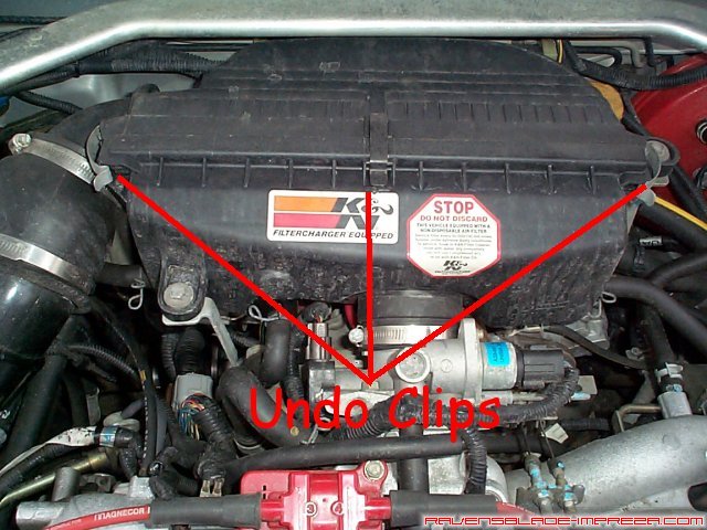 Check/Replace Air Filter Element: If you have a disposable air filter element, it should be changed every 15,000 miles or so, more frequently if you live/drive in dusty conditions. If you have a reusable filter, it should be at least inspected, if not removed and reoiled. There are three clips holding the airbox closed (four if your airbox is located out at the fender) as indicated in the photo. Ensure you seal the box well when you reinstall your filter, as an improperly sealed filter box can result in a Check Engine Light.