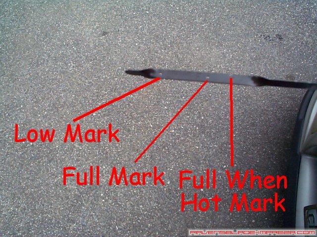 Check Oil Level: There are three marks on your dipstick- two holes and one notch. the bottom hole is the "low" mark, the top hole is the "full" mark, and the notch should be the maximum height of oil when the engine is hot. Too much oil can be frothed up by the crankshaft, which is just as bad as running with too little oil. Changing the oil will be covered a little bit later.